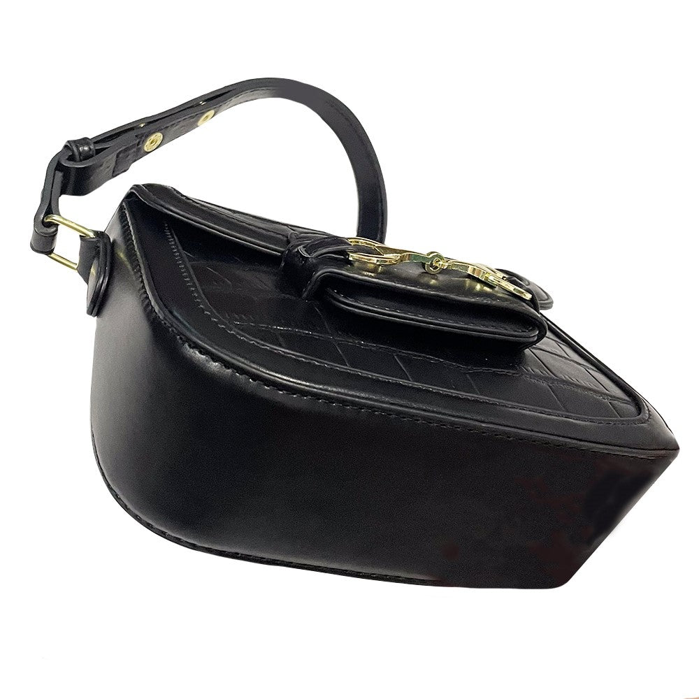 - Designer-look, with classic equestrian snaffle bit embellishment. Vegan leather with the look of the real thing. Fold-over top and zippered main compartment with interior accessory pocket. Shoulder strap adjusts from 22-40”.