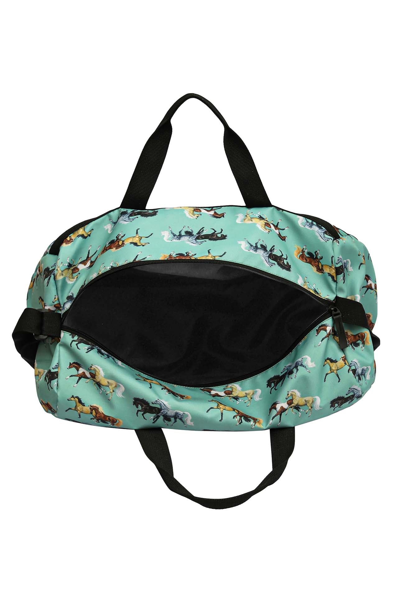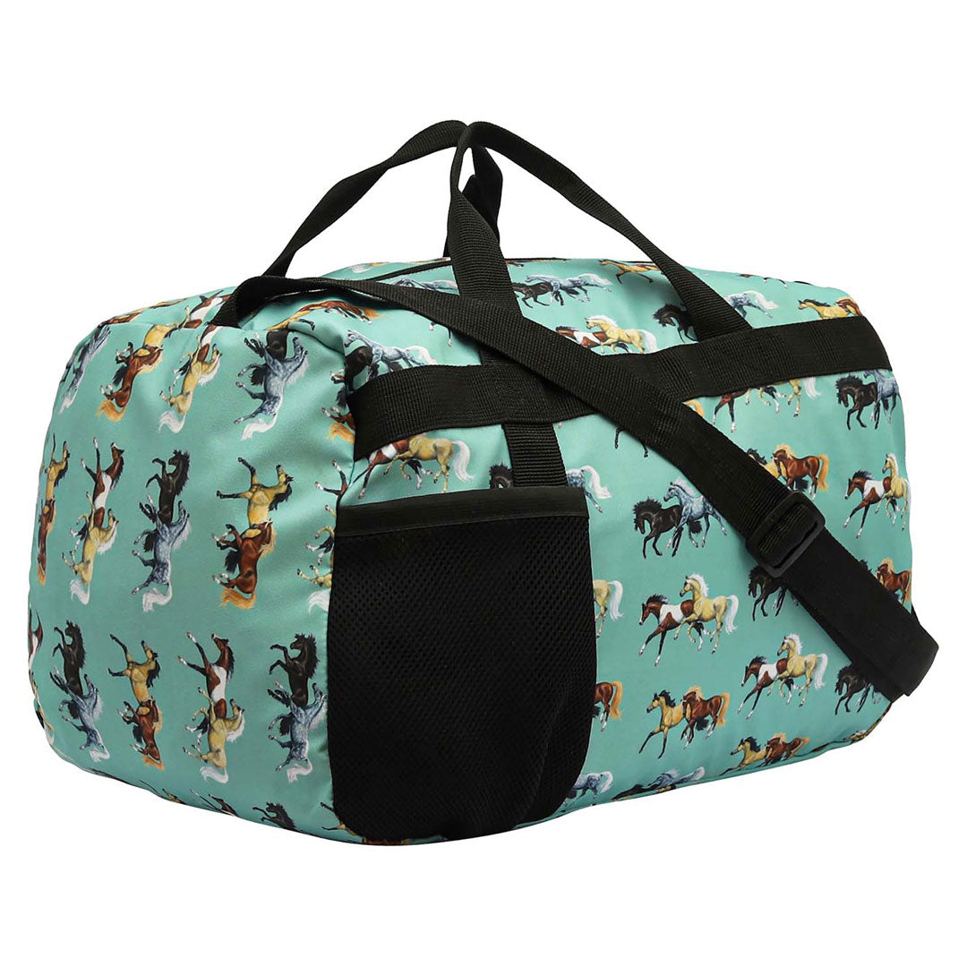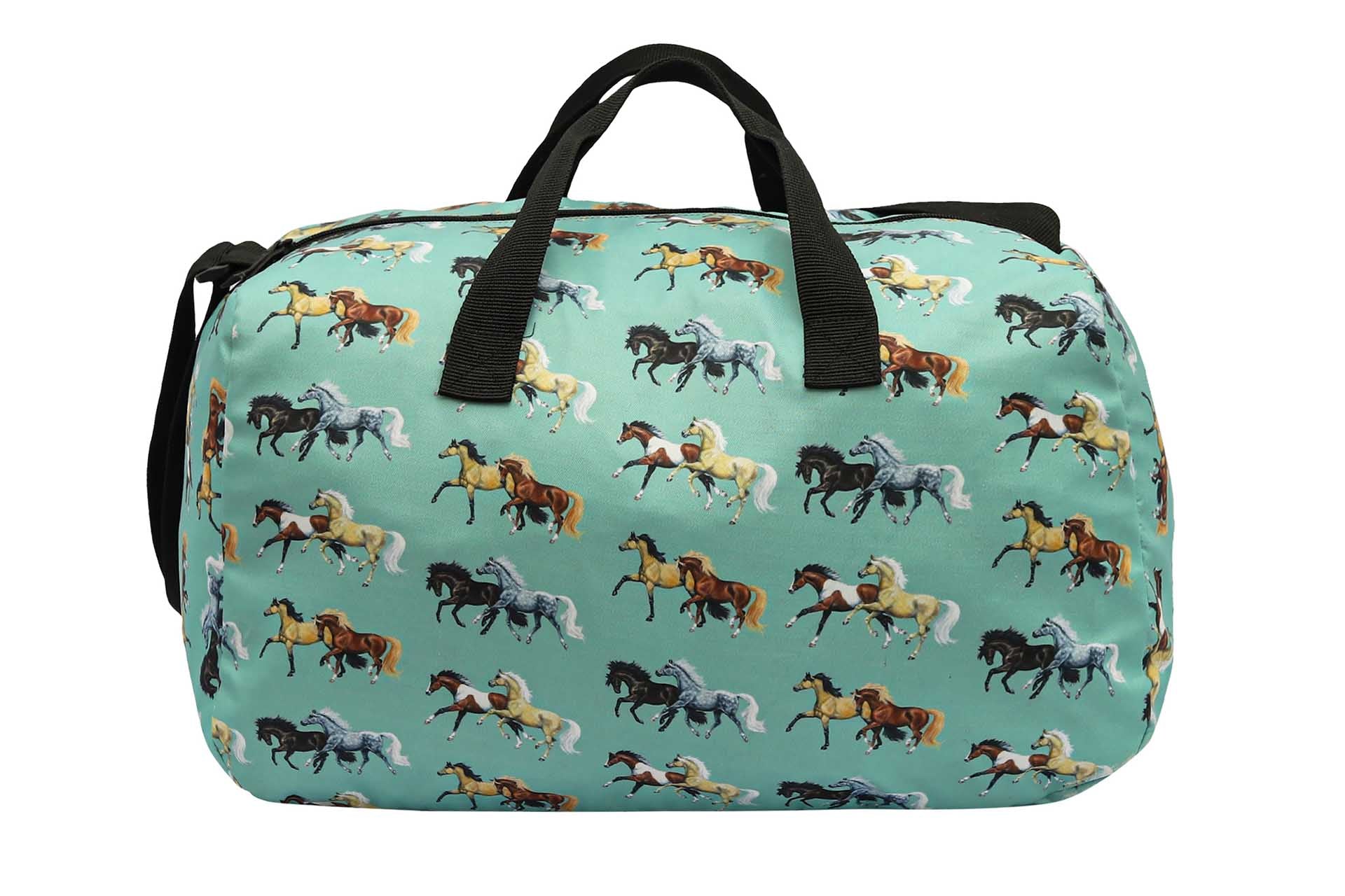- The AWST Int'l Lila Horse Pairs Duffel Bag is an ideal choice for a helmet bag, barn essentials, or a convenient overnighter. Crafted from durable 600D Polyester, this versatile duffle features a spacious main compartment with a sturdy dual zipper for easy access. It also includes an internal divider pocket and a front mesh pocket, allowing for effortless organization. With its adjustable shoulder strap and convenient grab handles, this fashionable duffle bag is well-equipped for travel. Measures 15"L X 9"H X 9"W