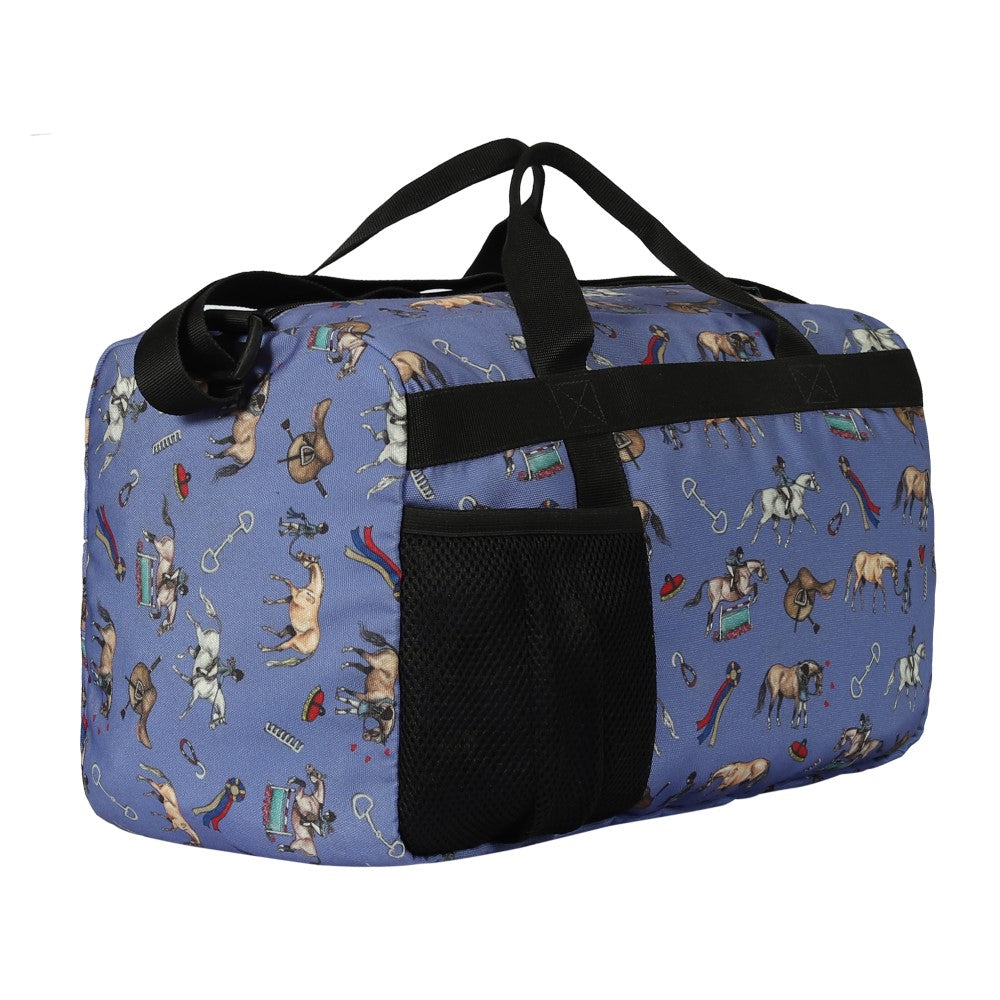 - The AWST Int'l "Lila" Hunter Ponies Duffle Bag is an ideal choice for a helmet bag, barn essentials, or a convenient overnighter. Crafted from durable 600D Polyester, this versatile duffle features a spacious main compartment with a sturdy dual zipper for easy access. It also includes an internal divider pocket and a front mesh pocket, allowing for effortless organization. With its adjustable shoulder strap and convenient grab handles, this fashionable duffle bag is well-equipped for travel. Measures 15"L X 9"H X 9"W
