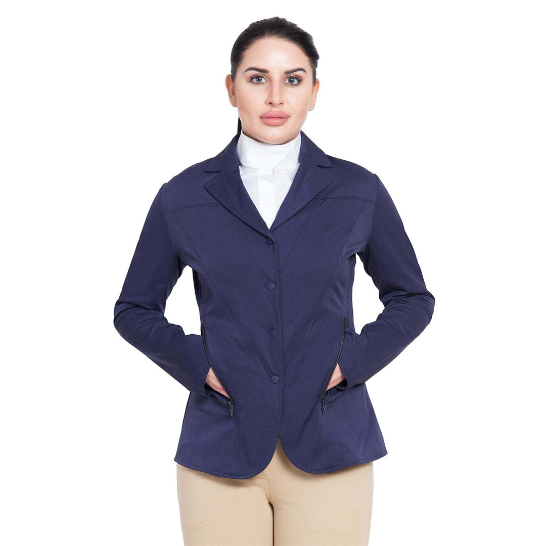• The Equine Couture Ladies Fiona Show Coat is an elegant yet modern design made from a light weight technical fabric to keep you cool and dry on the hottest show days. Slimming front lines and crystal details under the zipper pockets give this competition jacket just enough flair. The micro nylon and spandex fabric offers comfort with performance as well as easy care.