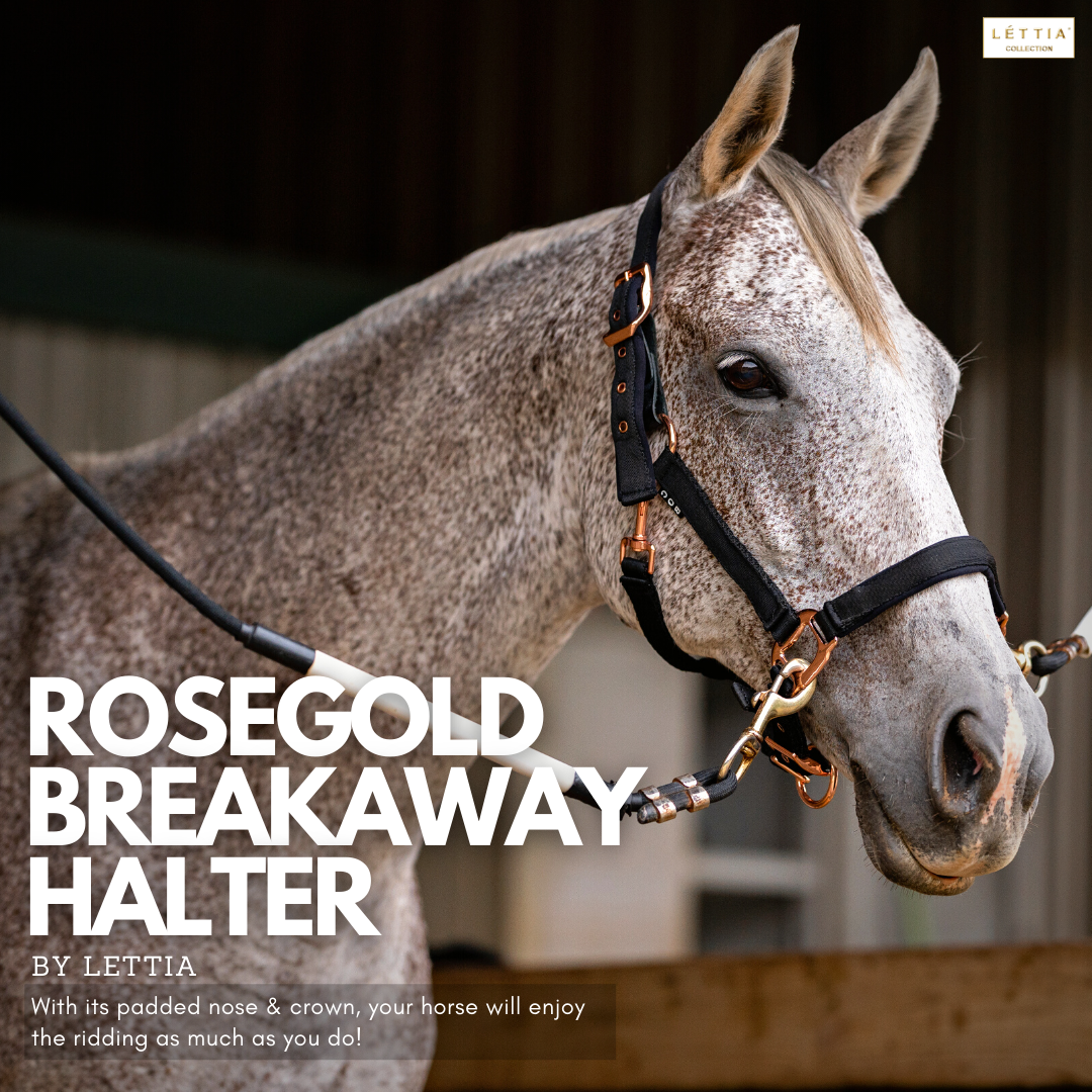 - This season let your horse look and feel special with this Rosegold Padded Leather Breakaway Halter designed by Lettia. This amazing halter gives a vintage and stylish appeal to your horse while the padded nose ensures to keep your horse comfortable. The crown attribute of the halter adds fascinating ascent and the rosegold hardware offers flashy outshine to your horse. For ensuring safety, this halter also comes with a breakaway tab which provides an easy releasing feature, and the tab is also designed with a leather strap to lend a very fashionable appeal to your horse making it's a safer choice for your horse.