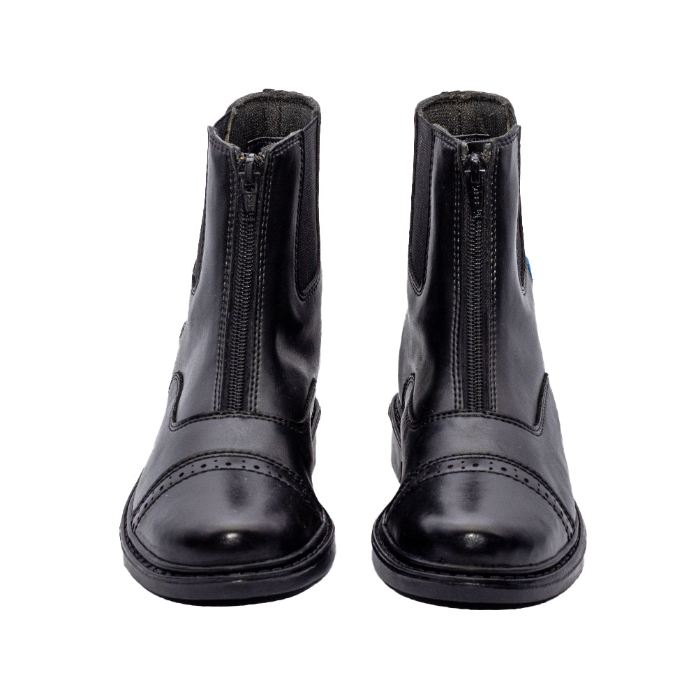 The TuffRider Children's Thelwell Sweep Front Zip Paddock Boots are designed for the most adorable little riders! Based on our best-selling Starter Front Zip Boot, features include elastic side gussets for comfort and fit and a rounded punched toe cap. The synthetic leather exterior and rubber outsole ensures these boots are water-resistant. Cleaning your new boots will be easy- just wipe with a damp cloth.