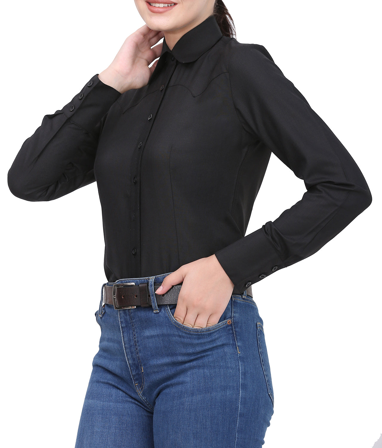 TuffRider's Ladies Americana Western Shirt offers smart style and superior protection, with a blend of quality materials, including 50% cotton, 35% viscose, and 15% polyester. It is designed to be breathable and moisture-wicking, and it also provides UV protection for extended outdoor wear. The high cuff featuring 3 buttons and front and back darting offers excellent fit and shape.