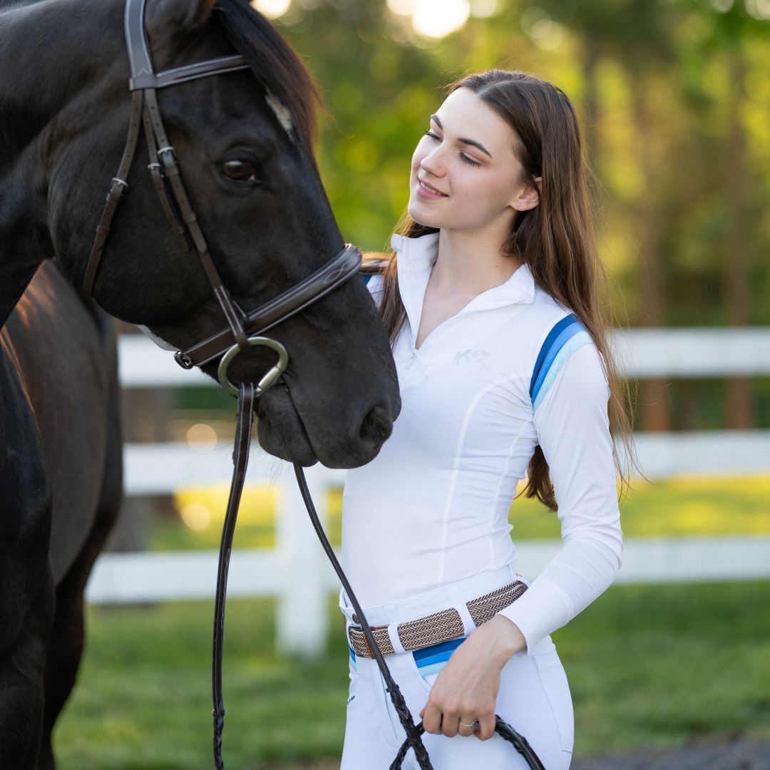 Introducing the Equine Couture Gradient Long Sleeve Show Shirt, a stylish and functional choice for many riding disciplines. This exceptional shirt features a convenient 3/4 zip-up collar, tailored to meet the demands of equestrian activities. The eye-catching gradient design effortlessly captures attention, while the curved hemline accentuates your natural silhouette. The long sleeves provide both comfort and coverage, ensuring a comfortable ride. Crafted from a durable blend of 89% polyester and 11% spandex to offer the perfect balance of durability and flexibility.