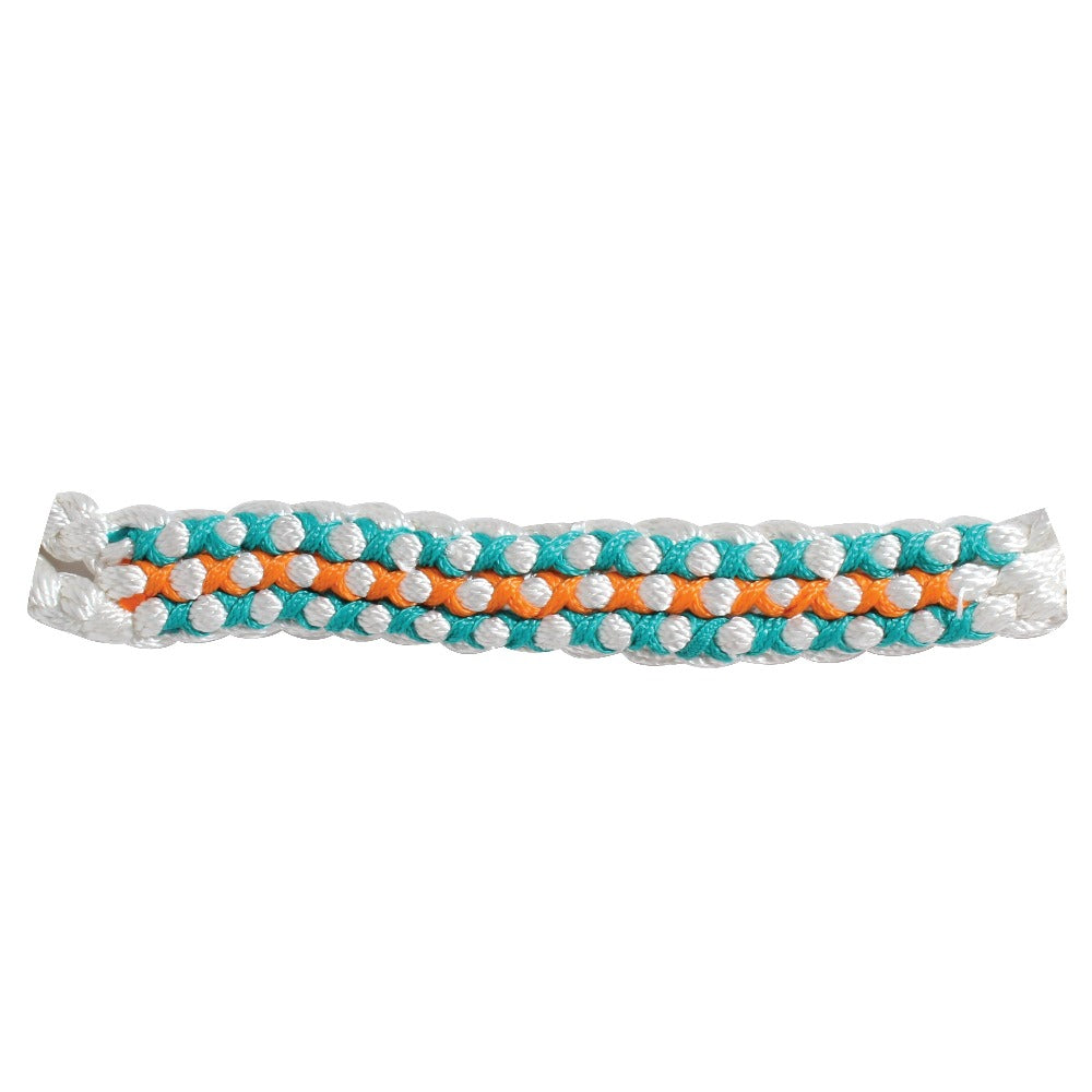 A braided soft yet sturdy rope halter that features a flat nose with colorful woven design and comes complete with a matching ten foot lead.
